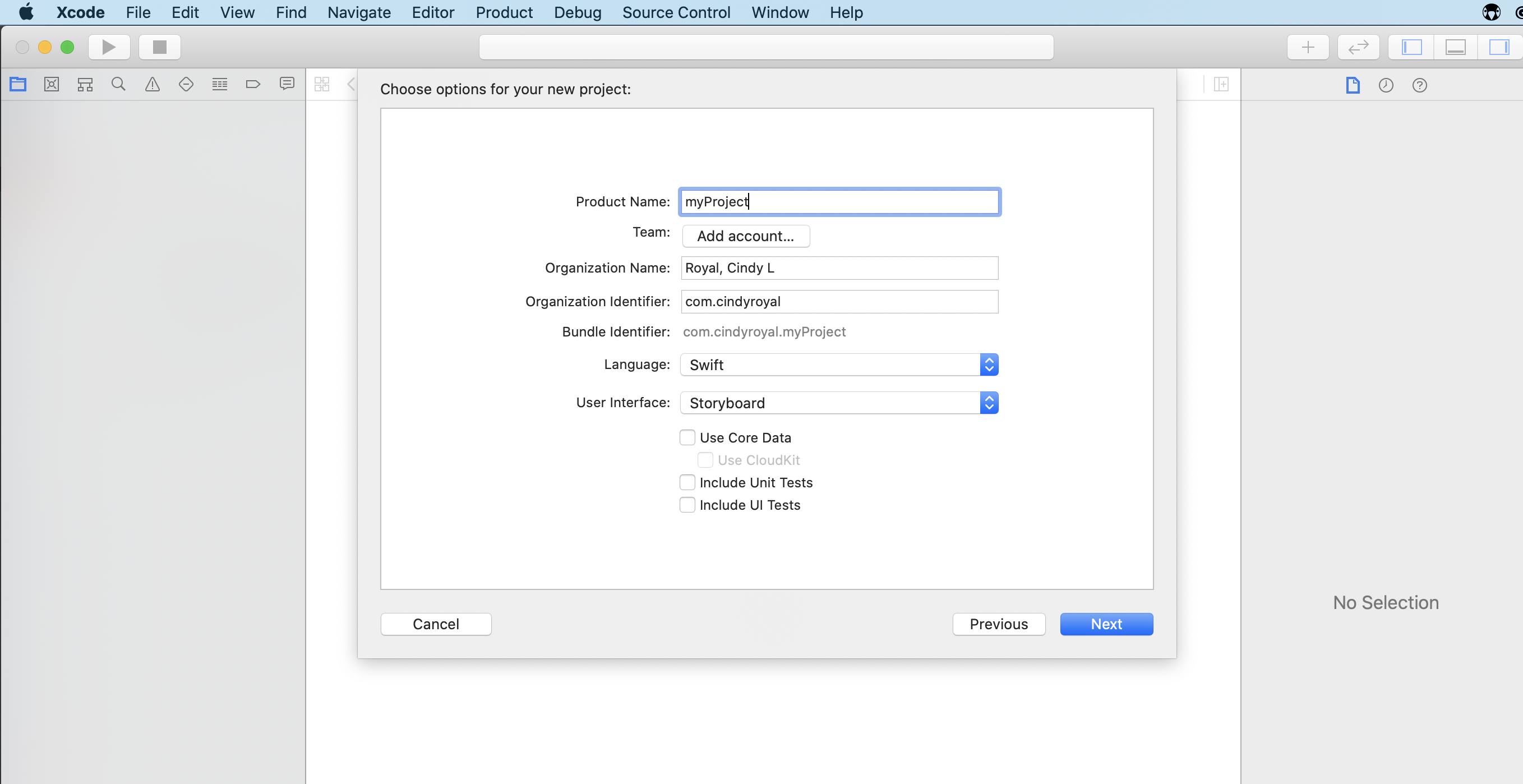- For Organizer Identifier, use a reverse domain name, like com.cindyroyal. This provides a unique identifier and goes from most general to specific (opposite of regular urls). Just needs to be unique so when you upload to App Store, you are uniquely identified. So just include com.yourname.
