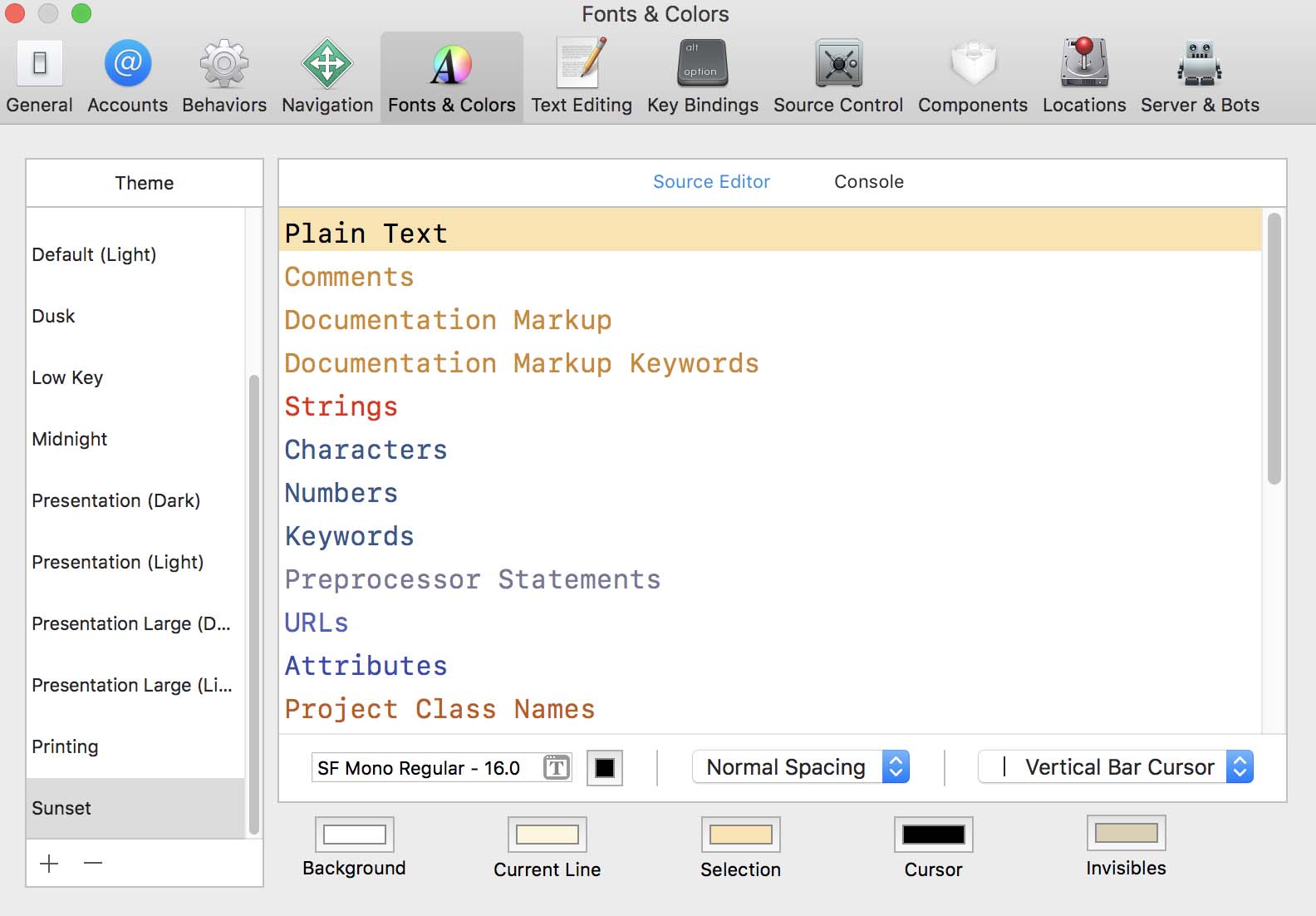 Xcode, Settings. Choose Themes to change how things look in XCode. Create a custom setting by duplicating default. Click plus button. Choose all the settings and can change font and size.